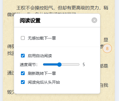 6、新增自动阅读功能,阅读页面自动下滑,可调整速度,滑到底部自动跳转到下一章,读完最后一章自动从第一章开始